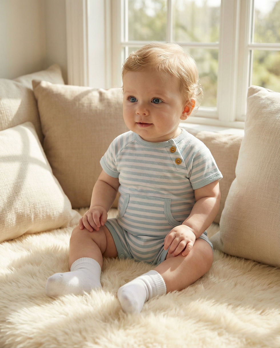Baby Boy Dungaree Romper Top Outfit Set Traditional Striped Spanish Style Beige