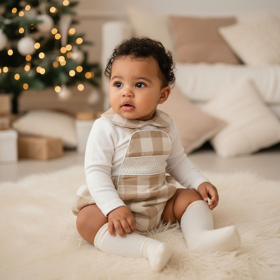 Baby Boy Romper Set Wee Me Outfit Bib Short Dungaree Shirt Smocked Check Camel